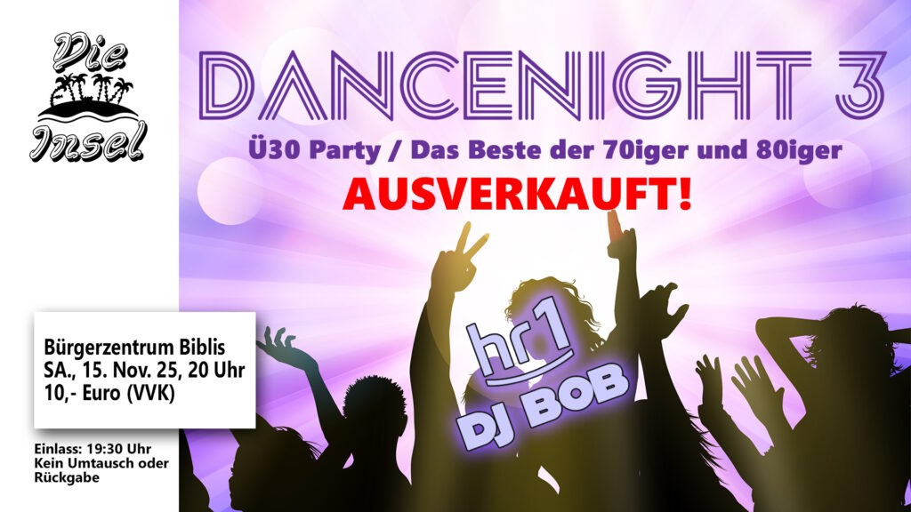 Filminsel Dancenight 2025 Samstag, 15. November 2025 Bürgerzentrum Biblis, 20 Uhr, Einlass: 19:30 Uhr Wollt Ihr einen unbeschwerten, sorgenfreien, durchgetanzten Abend mit Musik der 70iger/80iger Jahre erleben? Wir, das Team…